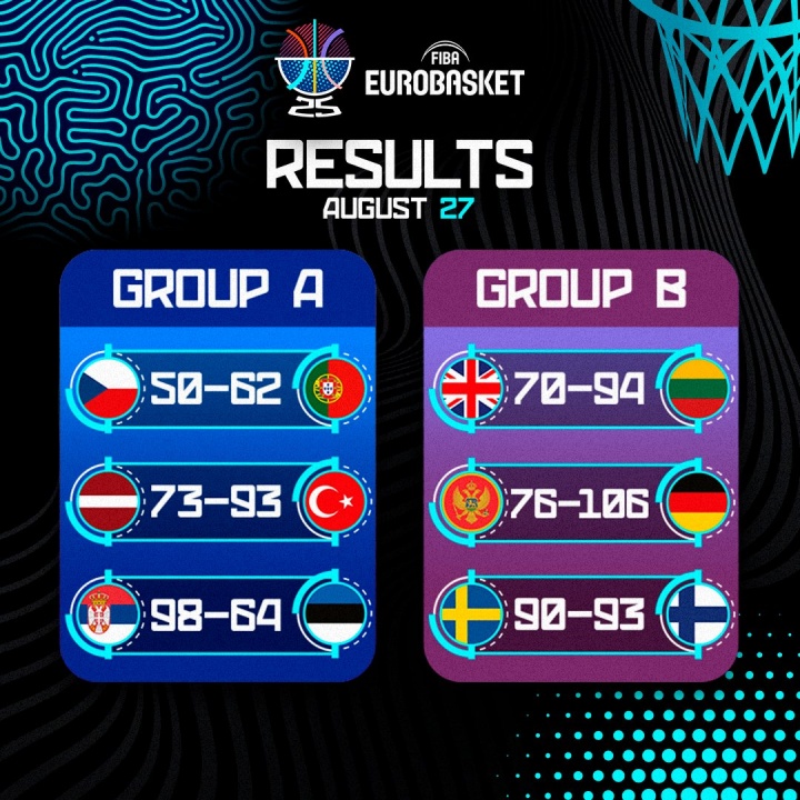 8月28日讯 男篮欧锦赛首日六场比赛结束,全部赛果如下: