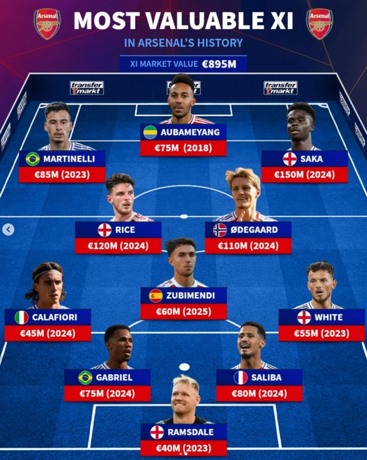 马丁内利(2023年,8500万欧)、奥巴梅扬(2018年,7500万欧)、萨卡(2024年,1.5亿欧)