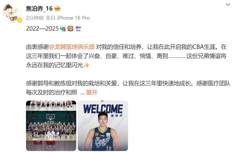 焦泊乔发文感谢了广州男篮的培养,也感谢了广东男篮的认可,原文如下: